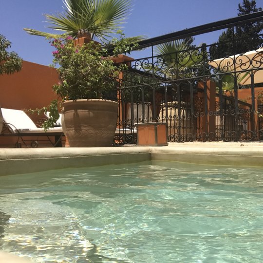La piscine de notre riad à Marrakech domine la Médina de Marrakech. Elle est idéalement située sur la terrasse du riad (à la différence des piscines situées à l'ombre des patios dans la plupart des riads situés à Marrakech). Pour votre confort, la piscine du Riad Hermes est chauffée à 28°C toute l'année.