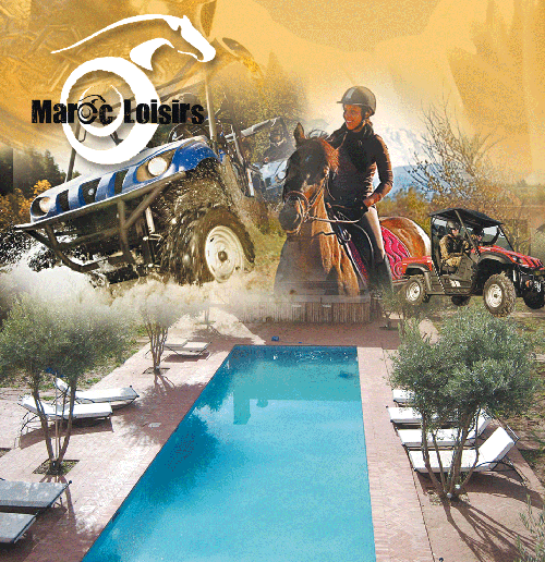 - Prise en charge (9h30 ou 13h30) au Riad Hermès (porte Ksour) ou au niveau Club Med (place Jemaa El Fna) et transfert vers la base de loisirs située à 11 Km de Marrakech sur la route de l’Ourika ;